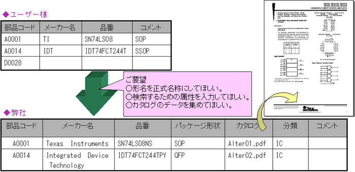 ユーザー様がお持ちの部品DBの整備を行うサービスです。部品属性データ追加・正式な形名の