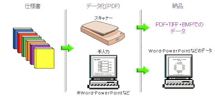 紙(仕様書)などを、スキャナー・手入力で電子データ化します。